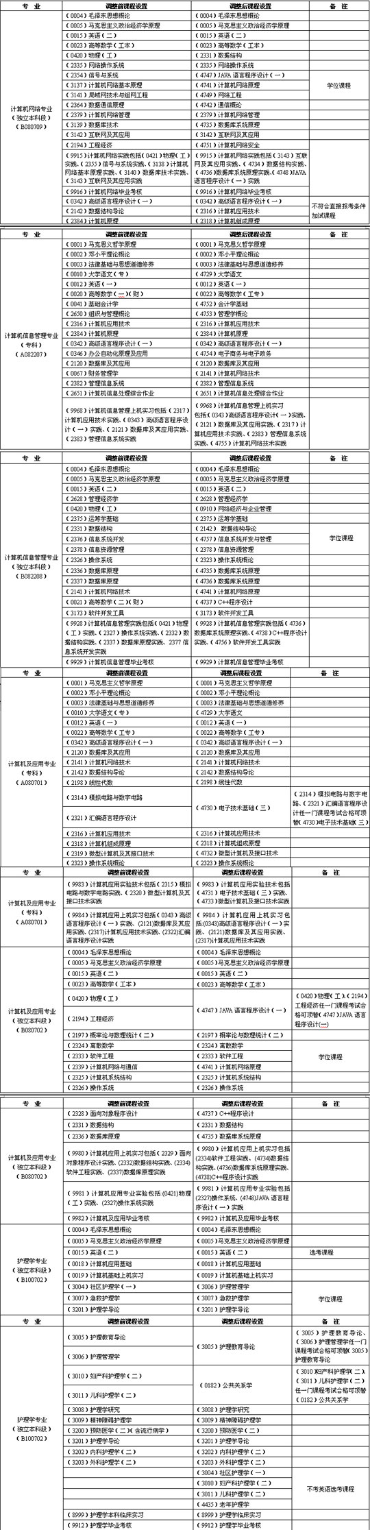 根據(jù)全國考委要求,我省對計算機網(wǎng)絡(luò)(獨立本科段)、計算機信息管理(專科)、計算機信息管理(獨立本科段)、計算機及應(yīng)用(專科)、計算機及應(yīng)用(獨立本科段)、護理學(xué)(獨立本科段)6個專業(yè)考試計劃的學(xué)位課程、實踐性環(huán)節(jié)考核課程、加試課程等課程進行了調(diào)整,現(xiàn)就有關(guān)問題通知如下: