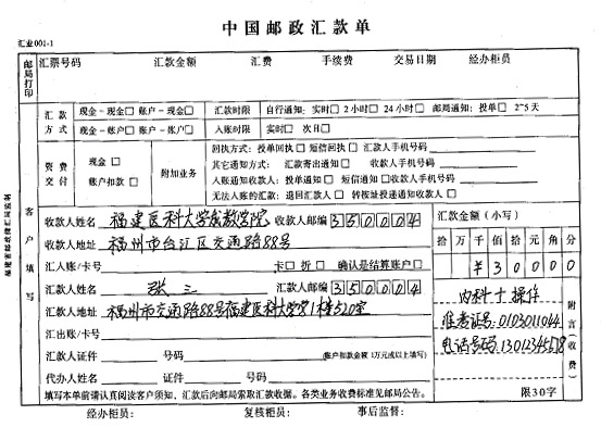一、繳款方式:根據(jù)學(xué)校財務(wù)處的有關(guān)規(guī)定,2007年自學(xué)考試實踐環(huán)節(jié)考核報名費的繳費方式統(tǒng)一采用郵局匯款。匯款時請正確填寫以下信息:收款人:福建醫(yī)科大學(xué)成人教育學(xué)院;郵編:350004;地址:福州臺江區(qū)交通路88號;匯款人(考生本人)姓名、郵編、詳細(xì)地址、附言欄填清報考科目及準(zhǔn)考證號。注意每張存單只能存一位考生的報名費并填寫電話號碼,以便聯(lián)系。