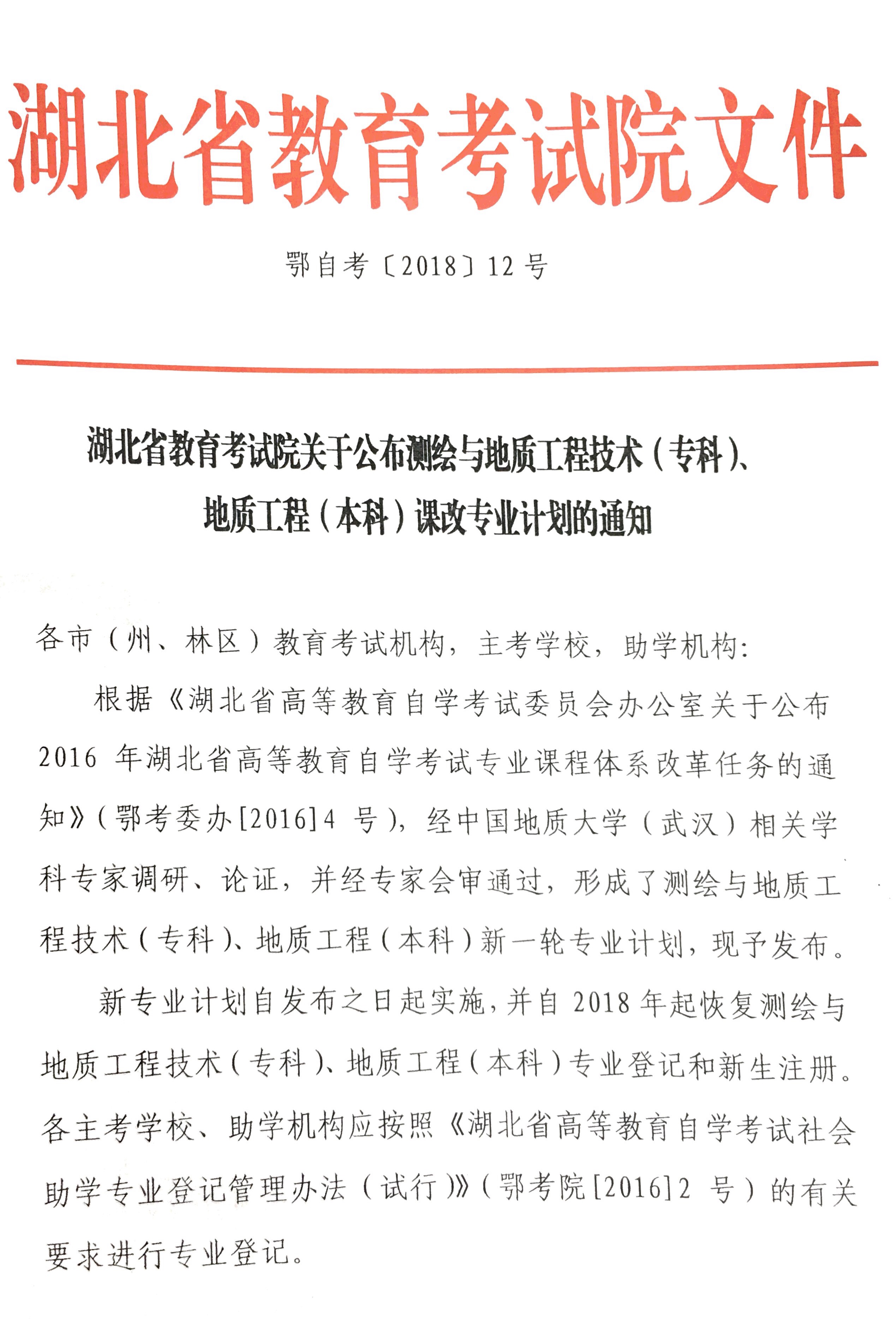 湖北公布測(cè)繪與地質(zhì)工程技術(shù)(專科)、地質(zhì)工程(本科)課改專業(yè)計(jì)劃的通知