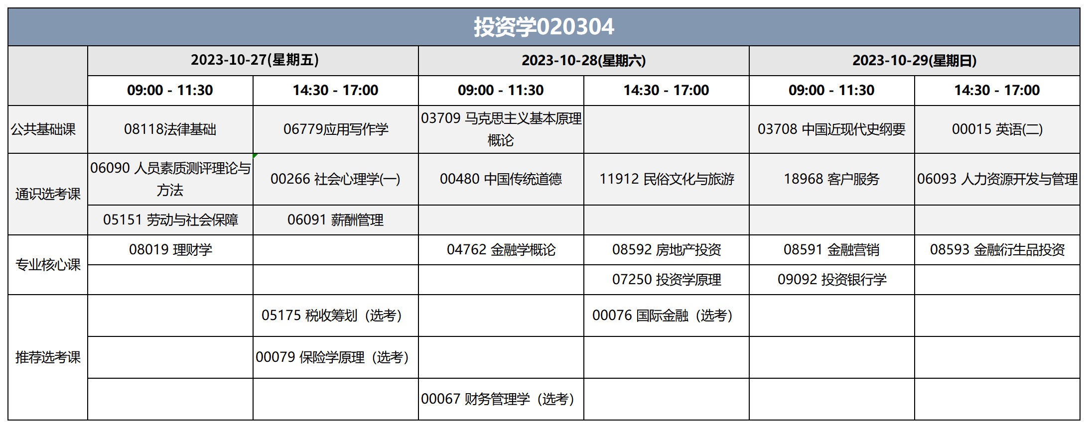 2023年10月湖北自考本科投資學專業(yè),專業(yè)代碼為020304,考試時間為10月27日-29日(周五至周日共3天),上午9:00-11:30,下午14:30-17:00。