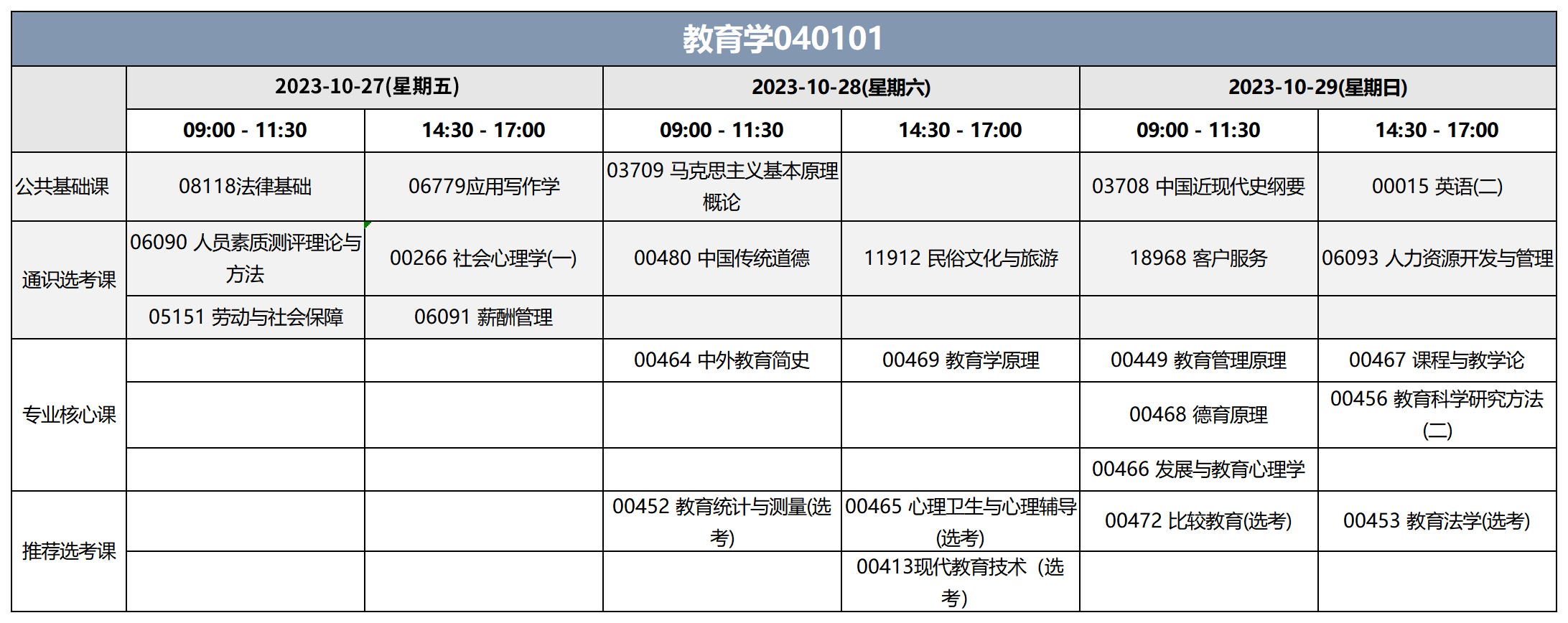2023年10月湖北自考本科教育學(xué)專業(yè),專業(yè)代碼為040101,考試時(shí)間為10月27日-29日(周五至周日共3天),上午9:00-11:30,下午14:30-17:00。