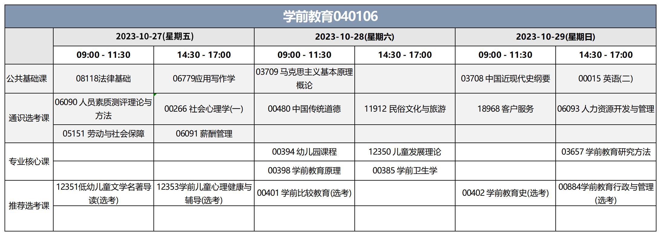 2023年10月湖北自考本科學前教育專業(yè),專業(yè)代碼為040106,考試時間為10月27日-29日(周五至周日共3天),上午9:00-11:30,下午14:30-17:00。