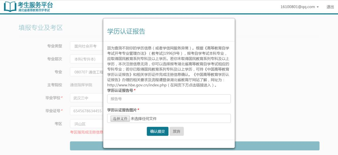 如果考生報(bào)考的是本科(專升本)專業(yè),需要有??苹蛞陨蠈W(xué)歷,提交注冊信息后,平臺會自動去學(xué)信網(wǎng)中查詢考生是否有??茖W(xué)歷,如果學(xué)信息網(wǎng)中查到考生??苹蛞陨蠈W(xué)歷,平臺會進(jìn)入第 7)步現(xiàn)場確認(rèn);如果平臺在學(xué)信網(wǎng)中沒有查到考生??茖W(xué)歷,需考生做學(xué)歷認(rèn)證報(bào)告并上傳學(xué)歷認(rèn)證報(bào)告,如下圖: