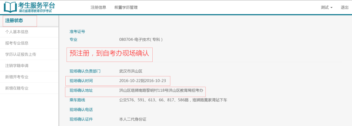 考生在所報(bào)考區(qū)規(guī)定時間內(nèi),攜帶個人居民身份證前往所報(bào)考區(qū)自考辦,驗(yàn)證身份信息并采集照片信息。如下圖,考生可在注冊狀態(tài)中查看狀態(tài)為預(yù)注冊,并有相應(yīng)操作提示: