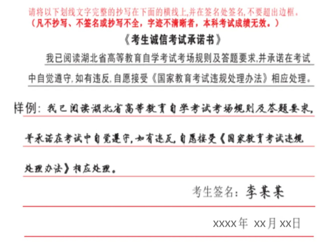 1.落實(shí)筆跡信息采集要求??忌鷳?yīng)在答題卡指定區(qū)域完整抄寫《考生誠(chéng)信考試承諾書》(抄寫樣例如下圖),凡不抄寫、不簽名或抄寫不全,字跡不清晰者,該科考試成績(jī)無(wú)效??忌厴I(yè)時(shí),省教育考試院將對(duì)每張答題卡上的《考生誠(chéng)信考試承諾書》筆跡進(jìn)行復(fù)核,凡筆跡不一致、經(jīng)鑒定為代考的,將根據(jù)《國(guó)家教育考試違規(guī)處理辦法》作出成績(jī)作廢、延遲畢業(yè)、記入國(guó)家教育考試誠(chéng)信檔案等處理。