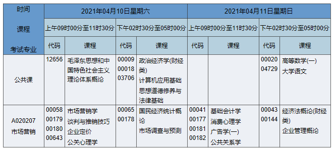 2021年4月湖南自考??剖袌鰻I銷專業(yè)考試時間為2021年4月10日-11日,2021年4月湖南自考??剖袌鰻I銷專業(yè)課程安排如下:
