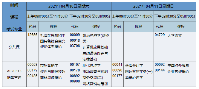 2021年4月湖南自考專科市場營銷(原銷售管理)專業(yè)考試時(shí)間為2021年4月10日-11日,2021年4月湖南自考??剖袌鰻I銷(原銷售管理)專業(yè)課程安排如下: