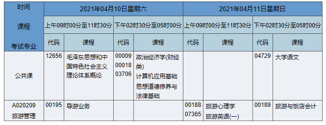 2021年4月湖南自考專科旅游管理專業(yè)課程安排表