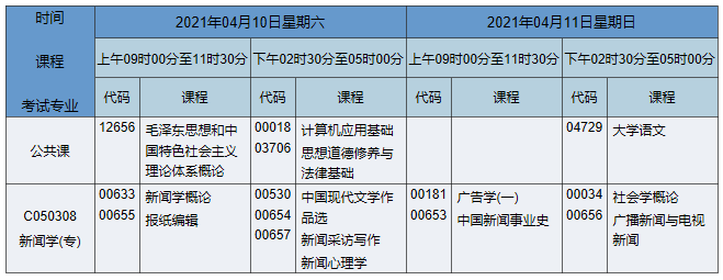 2021年4月湖南自考專科新聞學(xué)專業(yè)考試時(shí)間為2021年4月10日-11日,2021年4月湖南自考專科新聞學(xué)專業(yè)課程安排如下: