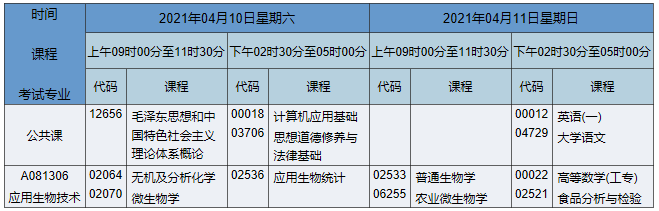 2021年4月湖南自考專科生物技術(shù)專業(yè)考試時(shí)間為2021年4月10日-11日,2021年4月湖南自考專科生物技術(shù)專業(yè)課程安排如下: