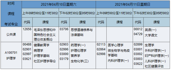 首頁 > 考試安排> 湖南考試安排 > 2021年4月湖南自考??谱o(hù)理專業(yè)課程安排表
