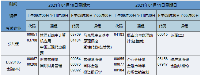 2021年4月湖南自考本科金融學(xué)專業(yè)課程安排表