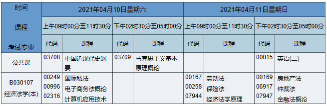 2021年4月湖南自考本科法學(xué)(原經(jīng)濟(jì)法學(xué))專業(yè)考試時(shí)間為2021年4月10日-11日,2021年4月湖南自考本科法學(xué)(原經(jīng)濟(jì)法學(xué))專業(yè)課程安排如下: