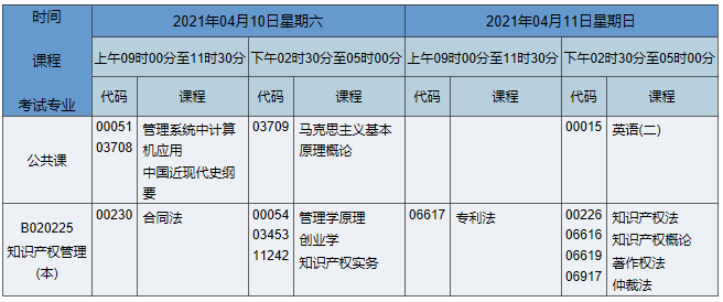 2021年4月湖南自考本科法學(xué)(原知識(shí)產(chǎn)權(quán)管理)專業(yè)課程安排表