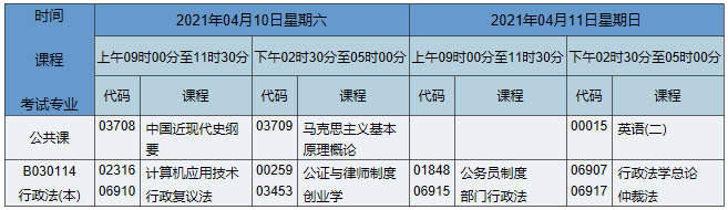 2021年4月湖南自考本科法學(原行政法)專業(yè)考試時間為2021年4月10日-11日,2021年4月湖南自考本科法學(原行政法)專業(yè)課程安排如下: