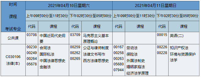 2021年4月湖南自考本科法學(xué)(原法律)專業(yè)課程安排表