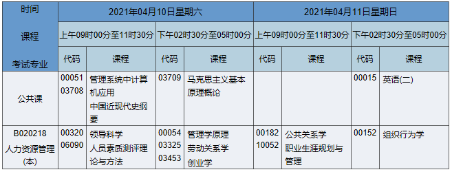 2021年4月湖南自考本科人力資源管理專業(yè)課程安排表
