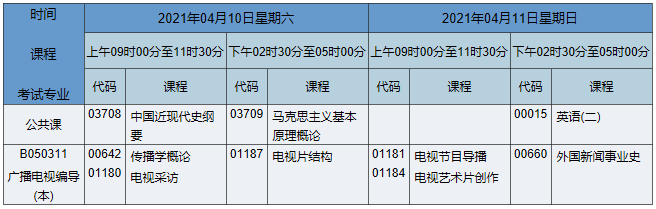 2021年4月湖南自考本科廣播電視編導(dǎo)專業(yè)考試時間為2021年4月10日-11日,2021年4月湖南自考本科廣播電視編導(dǎo)專業(yè)課程安排如下: