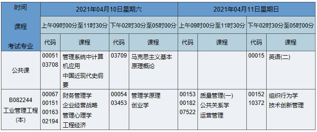 2021年4月湖南自考本科工業(yè)工程專業(yè)考試時間為2021年4月10日-11日,2021年4月湖南自考本科工業(yè)工程專業(yè)課程安排如下: