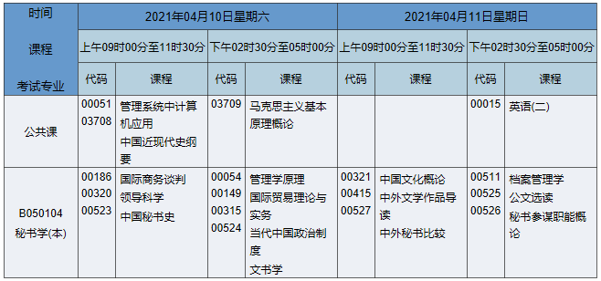 2021年4月湖南自考本科秘書學(xué)專業(yè)課程安排表