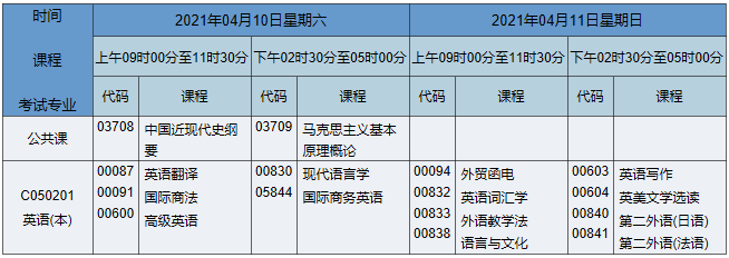2021年4月湖南自考本科英語(yǔ)專業(yè)課程安排表