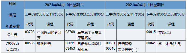 2021年4月湖南自考本科日語(yǔ)專業(yè)考試時(shí)間為2021年4月10日-11日,2021年4月湖南自考本科日語(yǔ)專業(yè)課程安排如下: