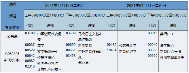 2021年4月湖南自考本科新聞學(xué)專業(yè)考試時(shí)間為2021年4月10日-11日,2021年4月湖南自考本科新聞學(xué)專業(yè)課程安排如下: