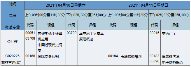2021年4月湖南自考本科工商管理(原商務(wù)管理)專業(yè)考試時間為2021年4月10日-11日,2021年4月湖南自考本科工商管理(原商務(wù)管理)專業(yè)課程安排如下: