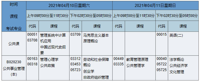 2021年4月湖南自考本科公共事業(yè)管理專業(yè)考試時間為2021年4月10日-11日,2021年4月湖南自考本科公共事業(yè)管理專業(yè)課程安排如下: