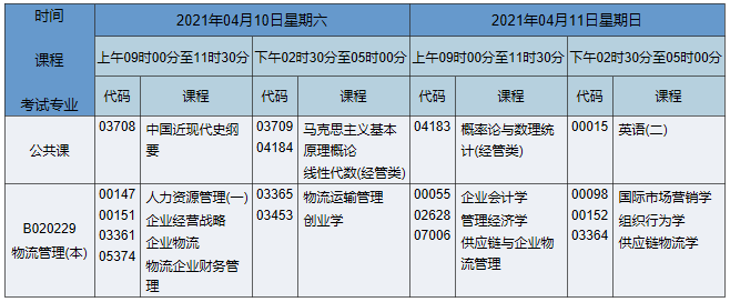 2021年4月湖南自考本科物流管理專業(yè)考試時間為2021年4月10日-11日,2021年4月湖南自考本科物流管理專業(yè)課程安排如下: