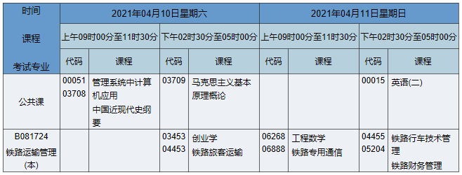 2021年4月湖南自考本科交通運輸專業(yè)考試時間為2021年4月10日-11日,2021年4月湖南自考本科交通運輸專業(yè)課程安排如下: