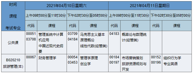 2021年4月湖南自考本科旅游管理專業(yè)考試時間為2021年4月10日-11日,2021年4月湖南自考本科旅游管理專業(yè)課程安排如下: