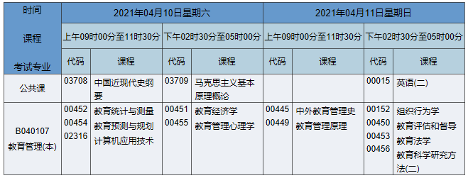2021年4月湖南自考本科教育管理專(zhuān)業(yè)考試時(shí)間為2021年4月10日-11日,2021年4月湖南自考本科教育管理專(zhuān)業(yè)課程安排如下: