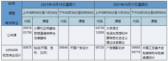 2021年10月湖南自考??埔曈X傳播設(shè)計與制作(原視覺傳達(dá)設(shè)計)專業(yè)考試時間為2021年10月16日-17日,2021年10月湖南自考專科視覺傳播設(shè)計與制作(原視覺傳達(dá)設(shè)計)專業(yè)課程安排如下: