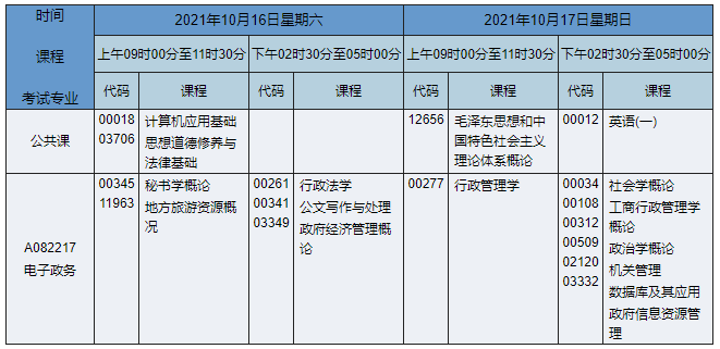 2021年10月湖南自考專科行政管理(原電子政務(wù))專業(yè)考試時(shí)間為2021年10月16日-17日,2021年10月湖南自考??菩姓芾恚ㄔ娮诱?wù))專業(yè)課程安排如下: