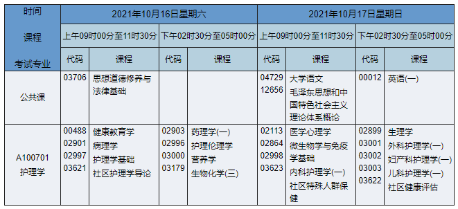 2021年10月湖南自考??谱o理專業(yè)課程安排表