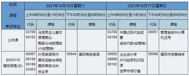 2021年10月湖南自考本科國際經(jīng)濟(jì)與貿(mào)易(原國際貿(mào)易)專業(yè)考試時(shí)間為2021年10月16日-17日,2021年10月湖南自考本科國際經(jīng)濟(jì)與貿(mào)易(原國際貿(mào)易)專業(yè)課程安排如下: