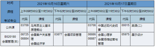 2021年10月湖南自考本科會(huì)展經(jīng)濟(jì)與管理(原會(huì)展管理)專業(yè)考試時(shí)間為2021年10月16日-17日,2021年10月湖南自考本科會(huì)展經(jīng)濟(jì)與管理(原會(huì)展管理)專業(yè)課程安排如下: