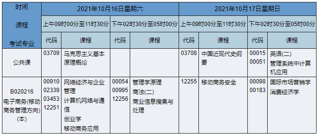 2021年10月湖南自考本科電子商務(wù)(原移動商務(wù)管理方向)專業(yè)課程安排表