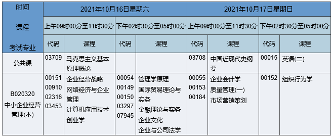 2021年10月湖南自考本科工商管理(原中小企業(yè)經(jīng)營(yíng)管理)專業(yè)考試時(shí)間為2021年10月16日-17日,2021年10月湖南自考本科工商管理(原中小企業(yè)經(jīng)營(yíng)管理)專業(yè)課程安排如下:
