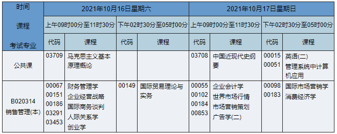 2021年10月湖南自考本科市場(chǎng)營(yíng)銷(原銷售管理)專業(yè)考試時(shí)間為2021年10月16日-17日,2021年10月湖南自考本科市場(chǎng)營(yíng)銷(原銷售管理)專業(yè)課程安排如下: