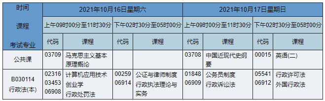 2021年10月湖南自考本科法學(xué)(原行政法)專業(yè)考試時間為2021年10月16日-17日,2021年10月湖南自考本科法學(xué)(原行政法)專業(yè)課程安排如下: