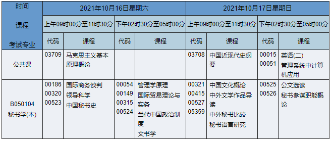 2021年10月湖南自考本科秘書學(xué)專業(yè)課程安排表