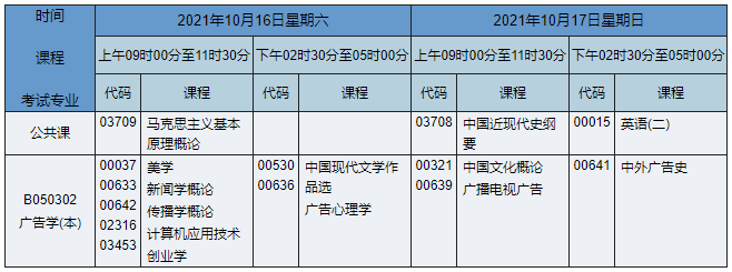 2021年10月湖南自考本科廣告學(xué)專業(yè)考試時間為2021年10月16日-17日,2021年10月湖南自考本科廣告學(xué)專業(yè)課程安排如下: