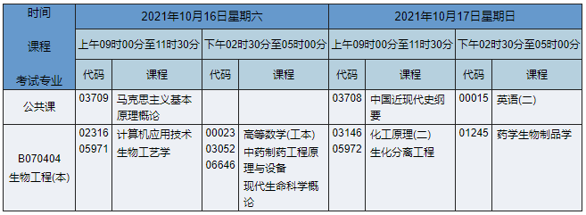 - 2021年10月湖南自考本科生物工程專業(yè)課程安排表