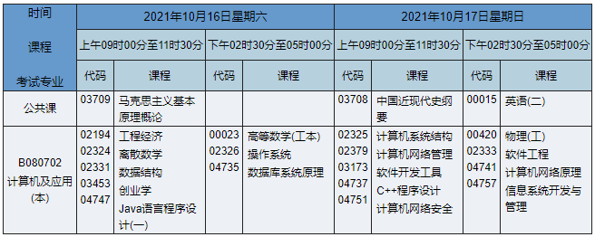 2021年10月湖南自考本科計(jì)算機(jī)科學(xué)與技術(shù)(原計(jì)算機(jī)及應(yīng)用)專業(yè)考試時(shí)間為2021年10月16日-17日,2021年10月湖南自考本科計(jì)算機(jī)科學(xué)與技術(shù)(原計(jì)算機(jī)及應(yīng)用)專業(yè)課程安排如下: