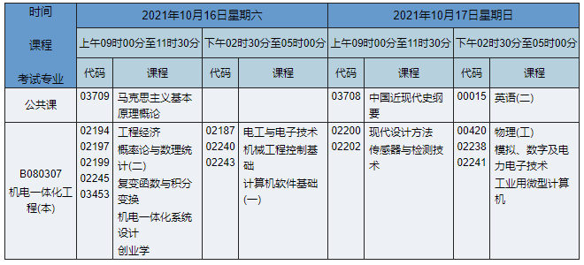 2021年10月湖南自考本科機(jī)械電子工程(原機(jī)電一體化工程)專業(yè)考試時間為2021年10月16日-17日,2021年10月湖南自考本科機(jī)械電子工程(原機(jī)電一體化工程)專業(yè)課程安排如下:
