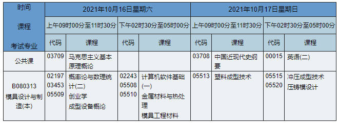 2021年10月湖南自考本科模具設(shè)計(jì)與制造專業(yè)考試時(shí)間為2021年10月16日-17日,2021年10月湖南自考本科模具設(shè)計(jì)與制造專業(yè)課程安排如下: