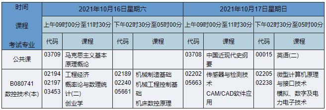 2021年10月湖南自考本科機械設(shè)計制造及其自動化(原數(shù)控技術(shù))專業(yè)考試時間為2021年10月16日-17日,2021年10月湖南自考本科機械設(shè)計制造及其自動化(原數(shù)控技術(shù))專業(yè)課程安排如下: