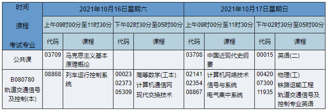 2021年10月湖南自考本科軌道交通信號(hào)與控制專業(yè)考試時(shí)間為2021年10月16日-17日,2021年10月湖南自考本科軌道交通信號(hào)與控制專業(yè)課程安排如下: